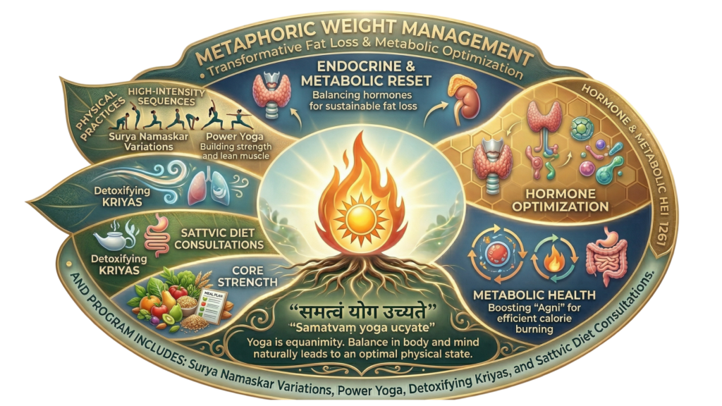 Transformative Fat Loss & Metabolic Optimization Moving beyond superficial fitness, our weight loss program focuses on endocrine balance and metabolic fire (Agni). We combine high-intensity traditional sequences with mindful detoxification.